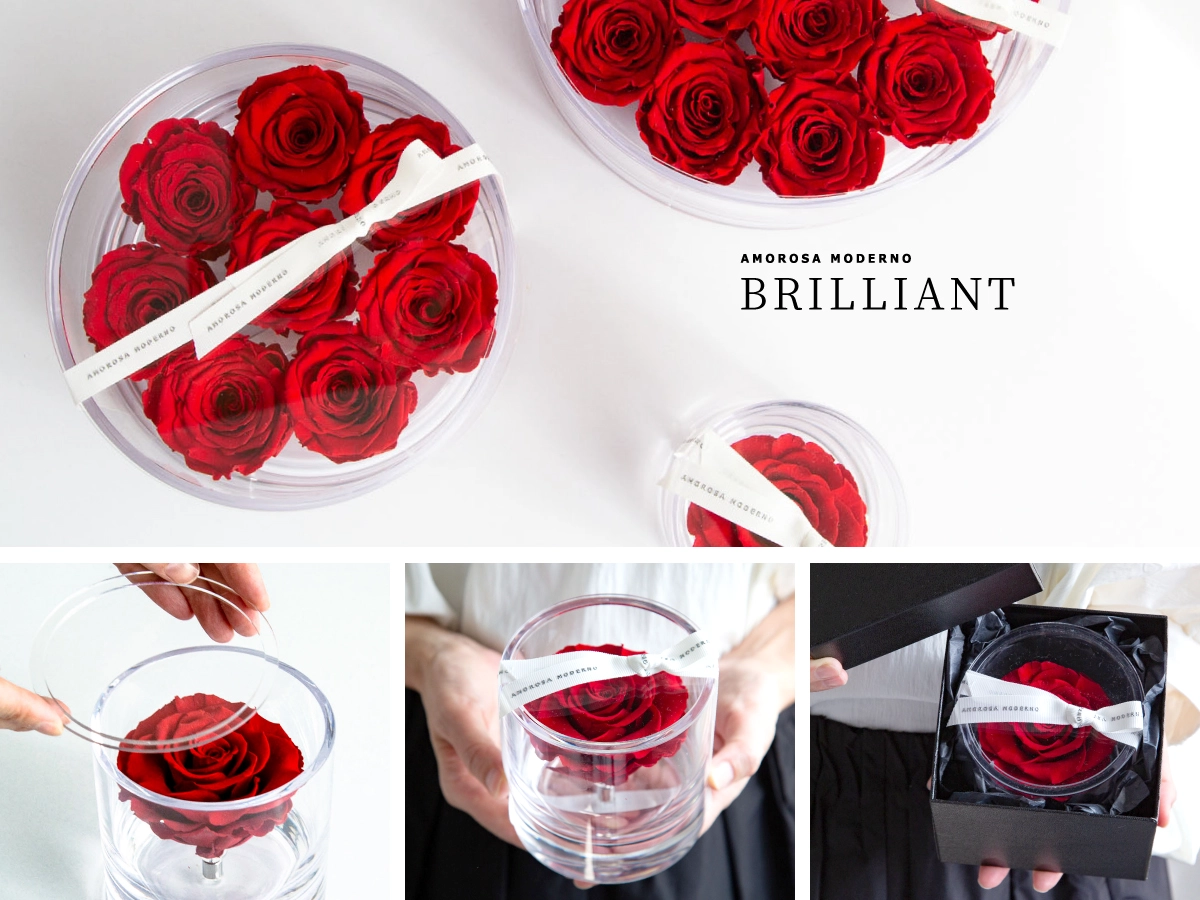 余計な装飾を排したミニマルな透明の器に、バラが宙に浮かぶように咲き誇るシンプルなデザイン。