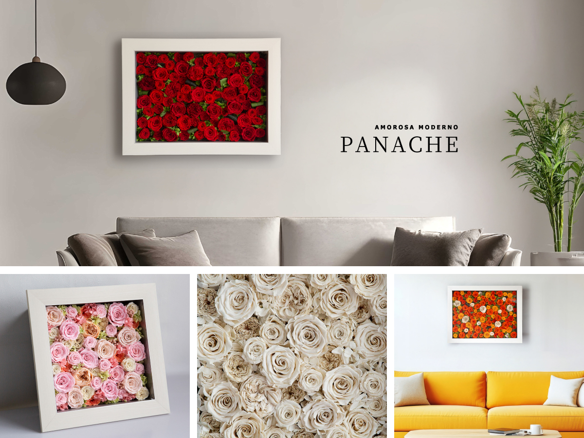 プリザーブドフラワーは、生花の美しさを長く楽しめる、新しい花のかたち。額装されたフレームの中で、花そのものがひとつのアートとして息づきます。