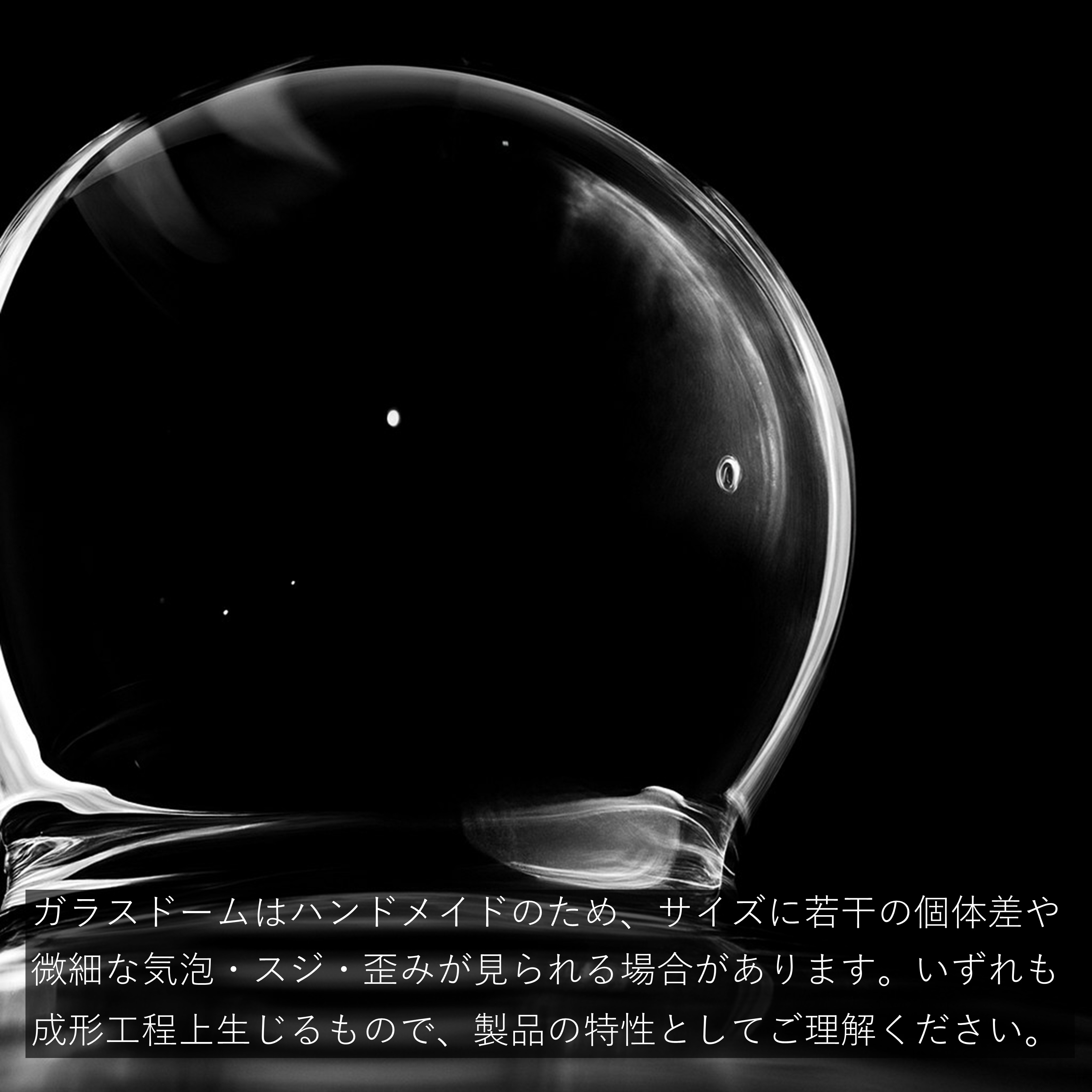 | 注意事項 | ●自然の花を加工しているため、色・形・大きさに個体差があります●花を直接手で触れると破損する場合があります●直射日光や強い光は色あせの原因となります●親油性のため油性塗料や樹脂を使用した家具・什器に触れると花の貼りつきや色移りが生じる恐れがあります●壁紙や布製品への色移りにご注意ください●エアコンの風等が直接当たると花のひび割れや色あせの原因となります●湿気に弱く花が透けることがあります●高温多湿の場所に長期間置くとカビや害虫が発生する恐れがあります●水やり不要●食用ではありません●ガラスドームはハンドメイドのため気泡・スジ・微細な歪みが見られる場合がありますが、成形工程上生じる製品の特性としてご理解ください●ガラスがくもった場合は水を含ませて固く絞った柔らかい布で拭いてください●木製台座には細かな傷・へこみがある場合があります |