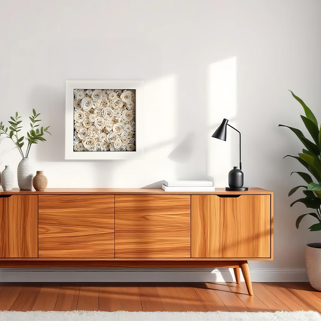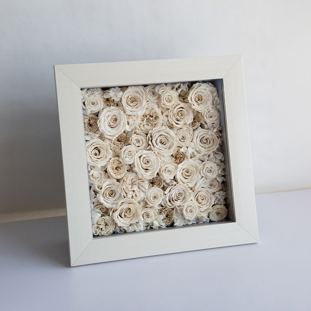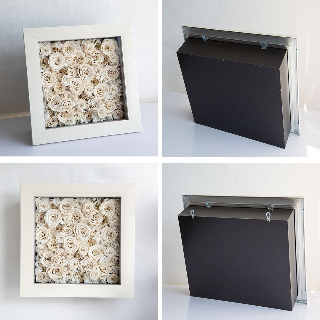 | 素材 | プリザーブドフラワー(ローズ、アジサイ)/フレーム(アルミ複合板、MDF、透明アクリル、吊り金具、吊り紐、直掛け用ビス付き/日本製) |