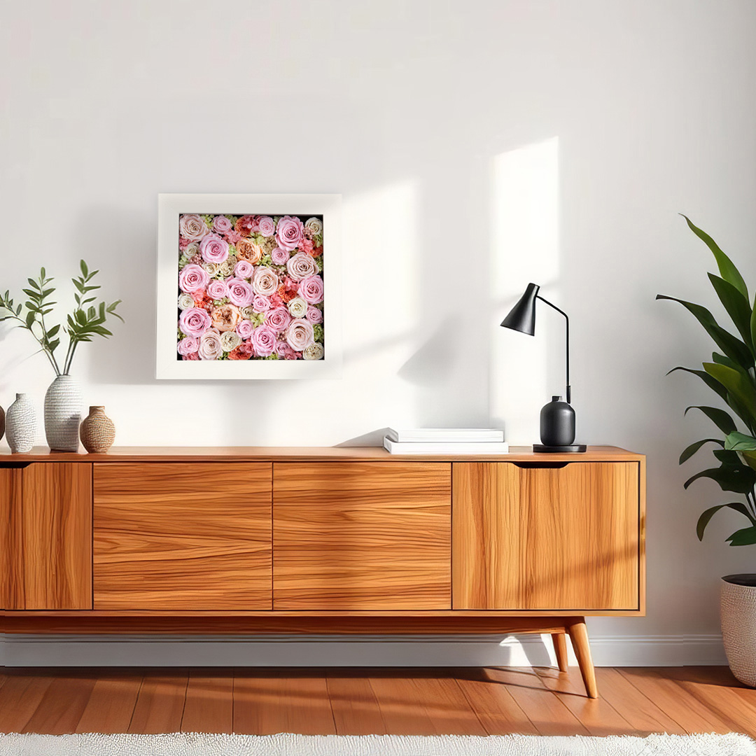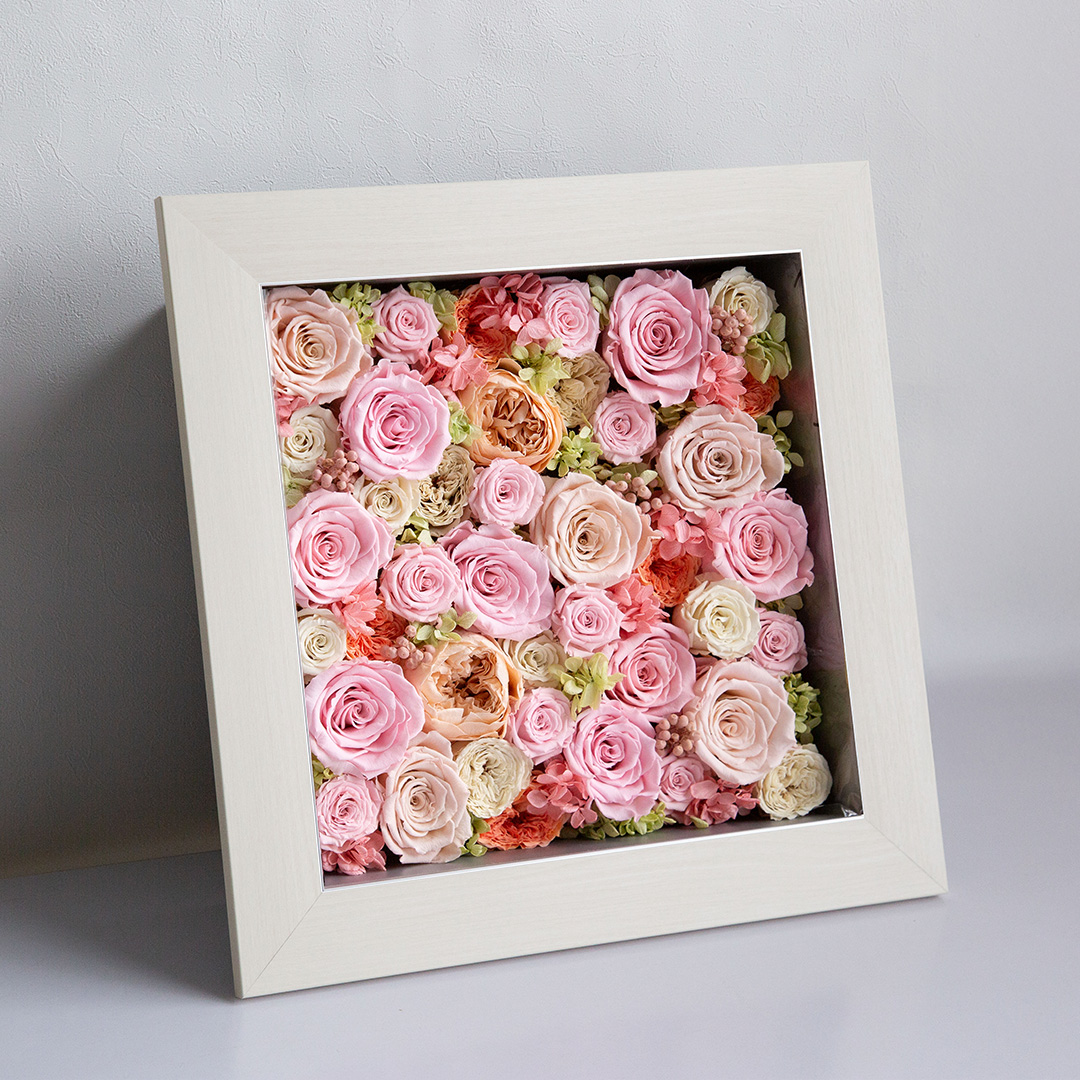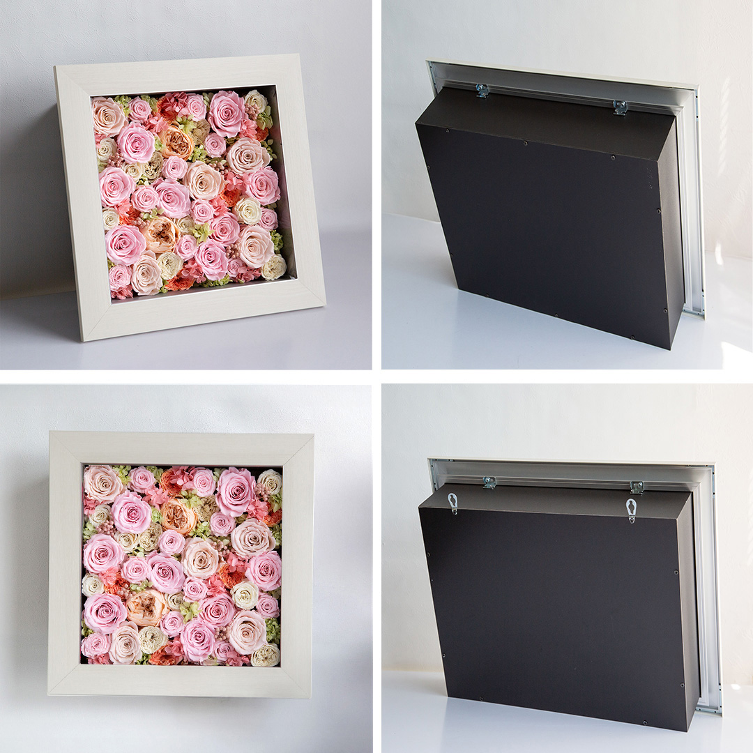 | 素材 | プリザーブドフラワー(ローズ、アジサイ、グリーン)/フレーム(アルミ複合板、MDF、透明アクリル、吊り金具、吊り紐、直掛け用ビス付き/日本製) |