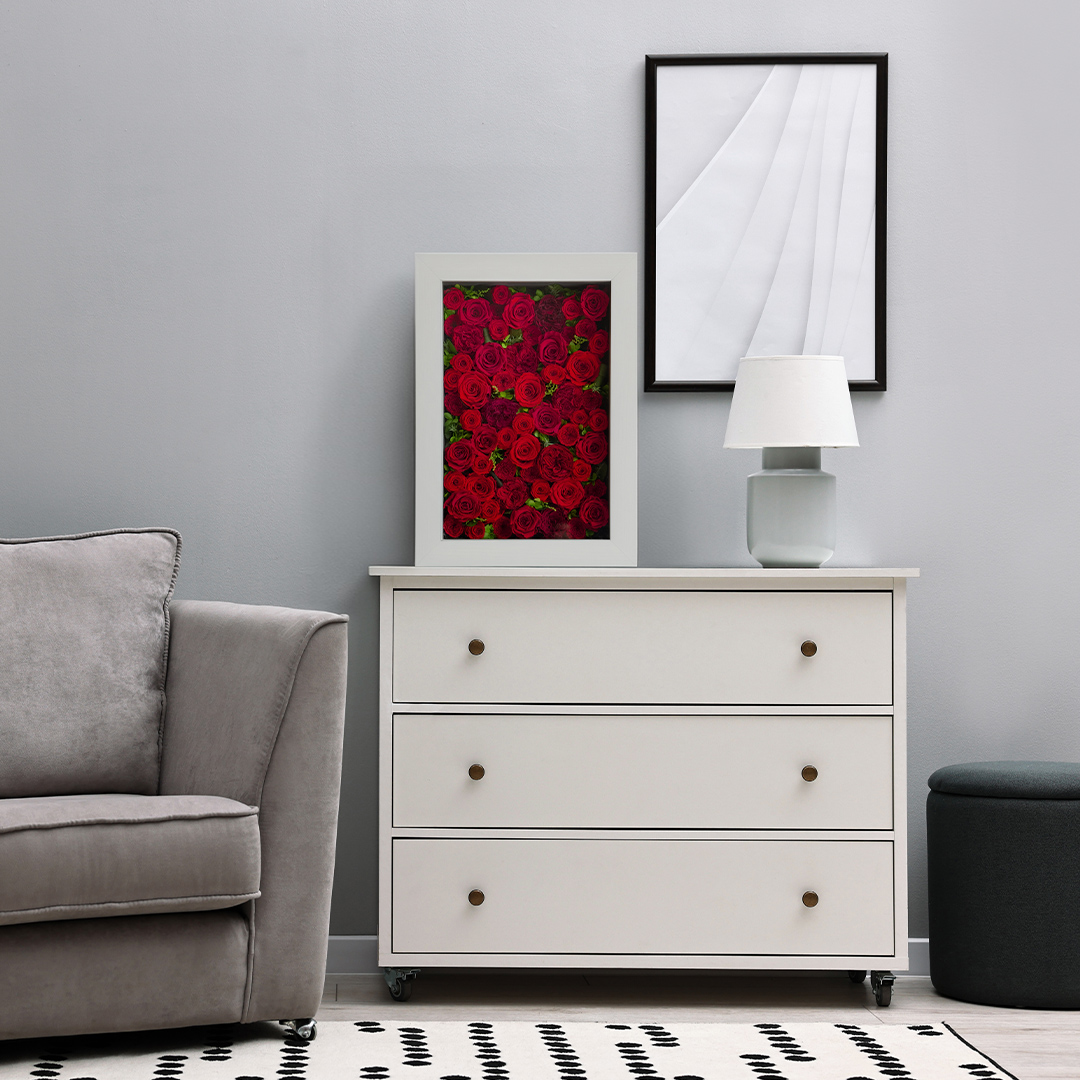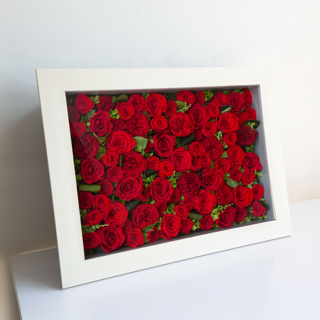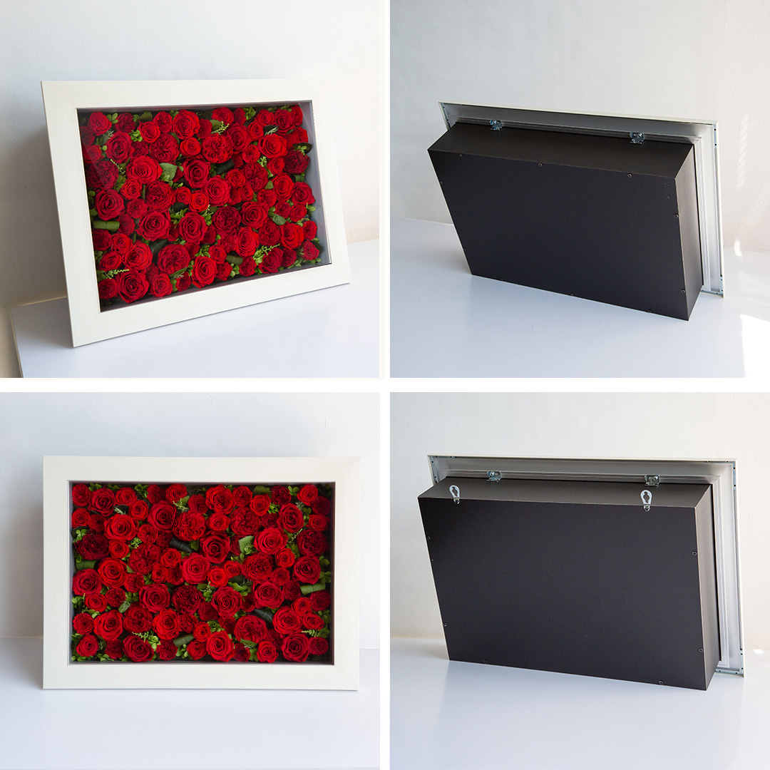 | 素材 | プリザーブドフラワー(ローズ、アジサイ、グリーン)/フレーム(アルミ複合板、MDF、透明アクリル、吊り金具、吊り紐、直掛け用ビス付き/日本製) |