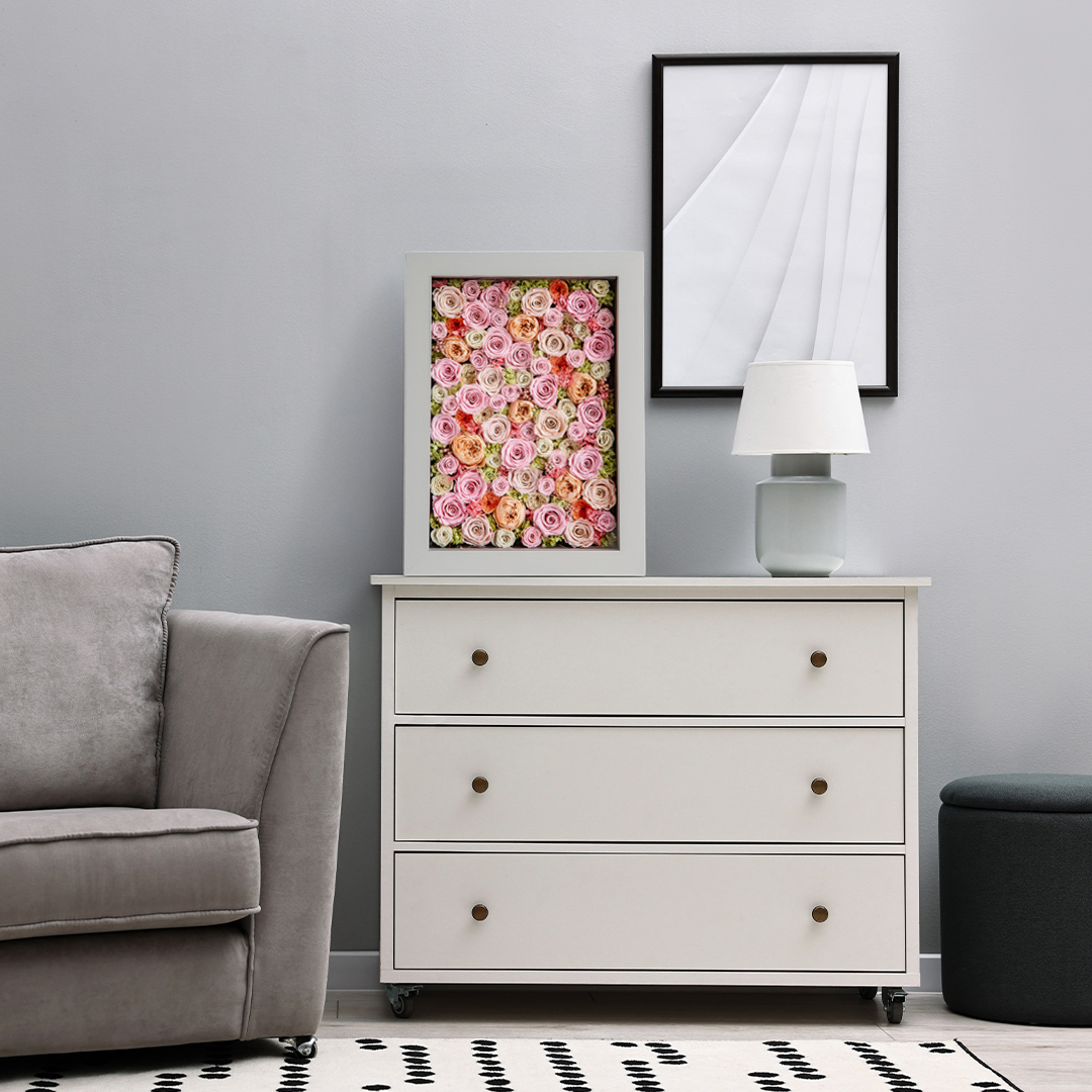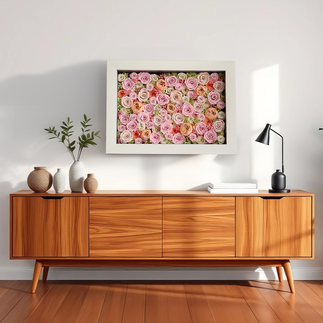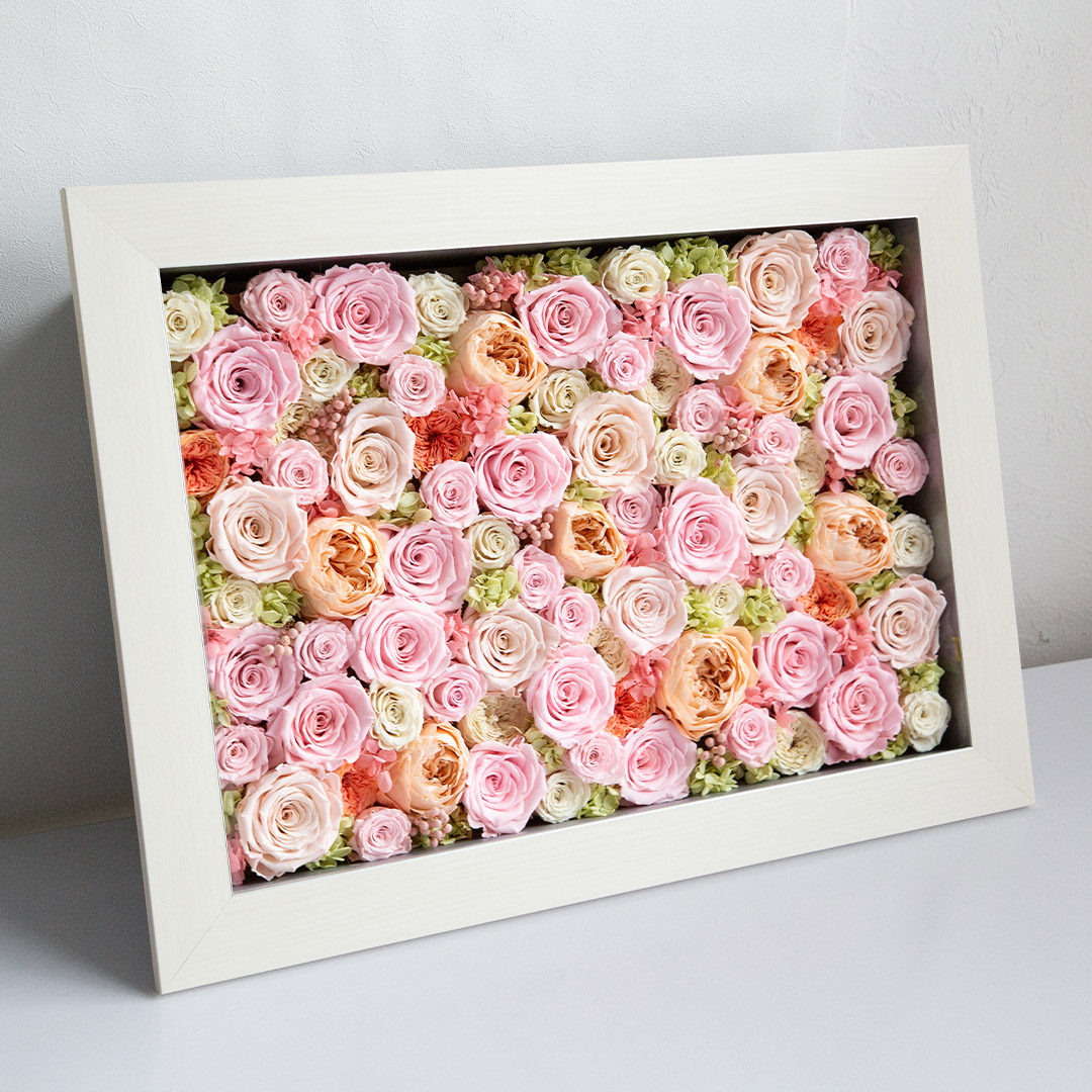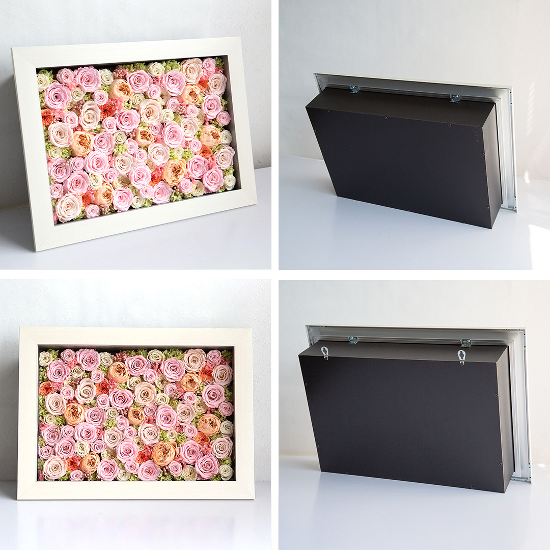 | 素材 | プリザーブドフラワー(ローズ、アジサイ、グリーン)/フレーム(アルミ複合板、MDF、透明アクリル、吊り金具、吊り紐、直掛け用ビス付き/日本製) |