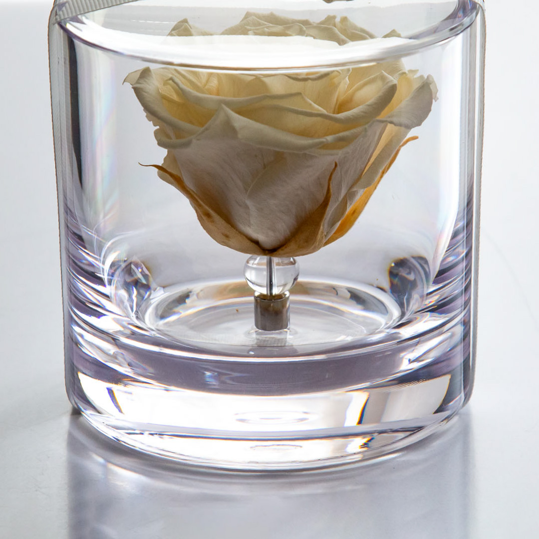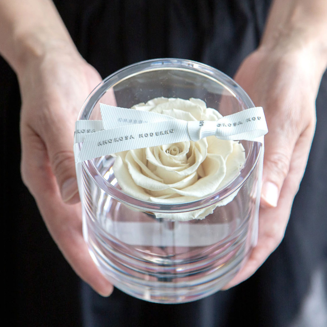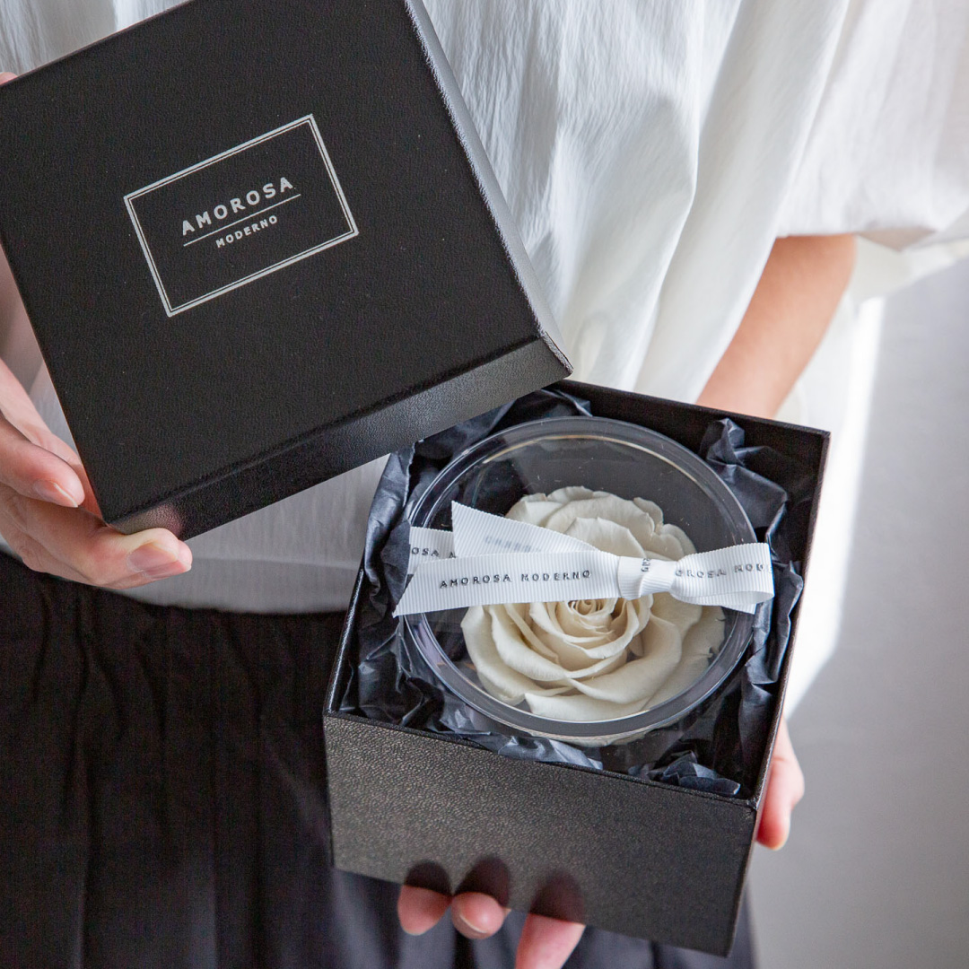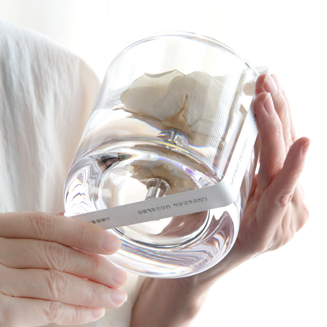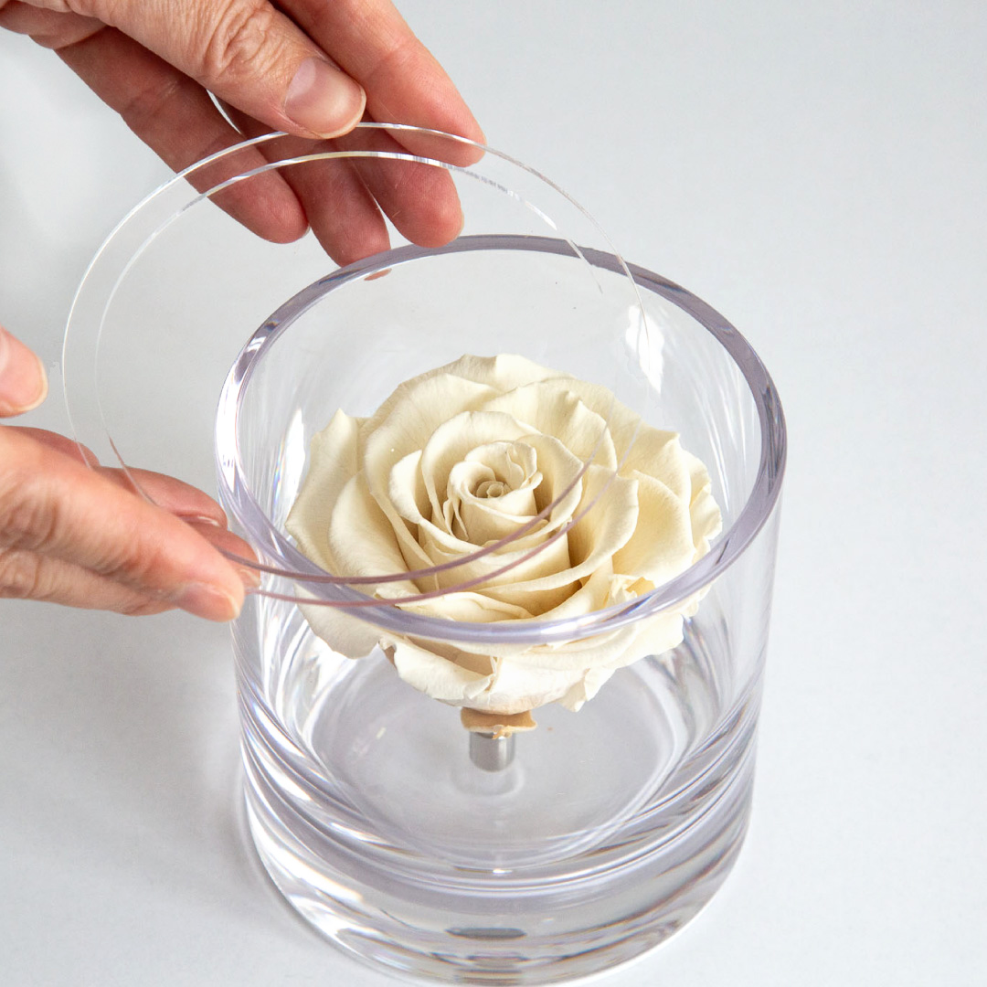 | 素材 | プリザーブドフラワー(ローズ)、真鍮、有機ガラス(容器)、アクリル(フタ)、天然水晶、リボン、化粧箱 |