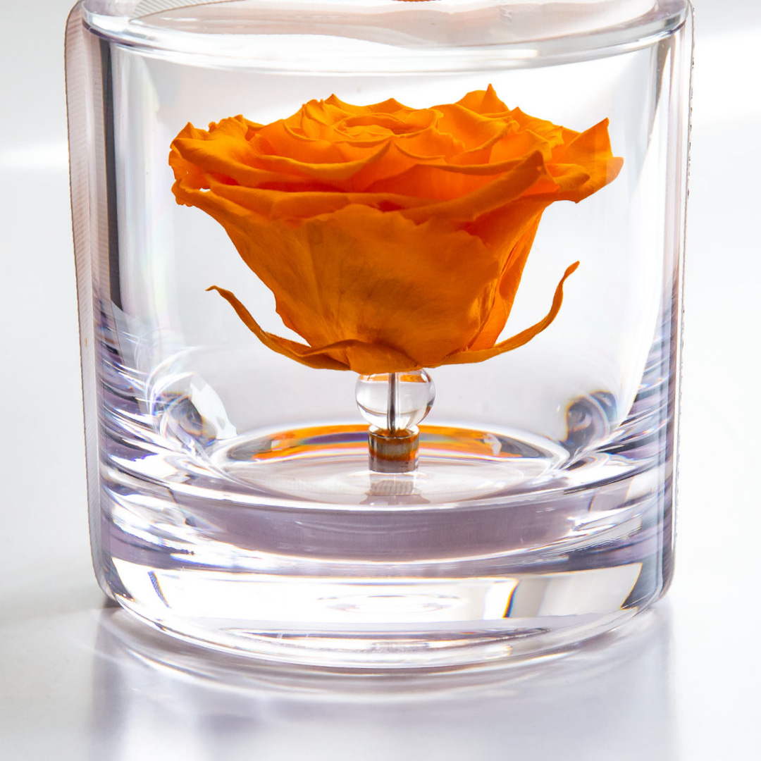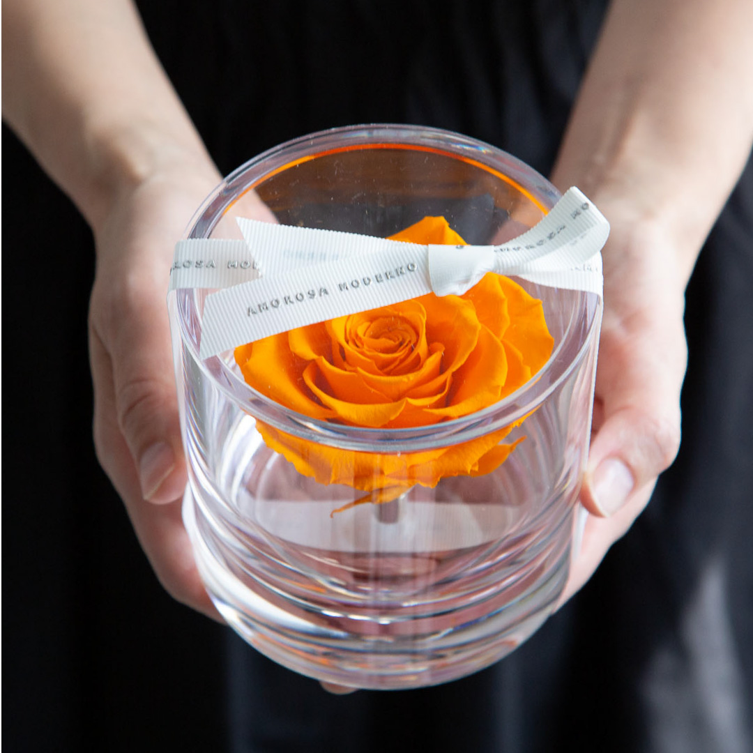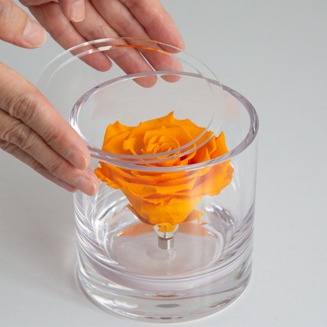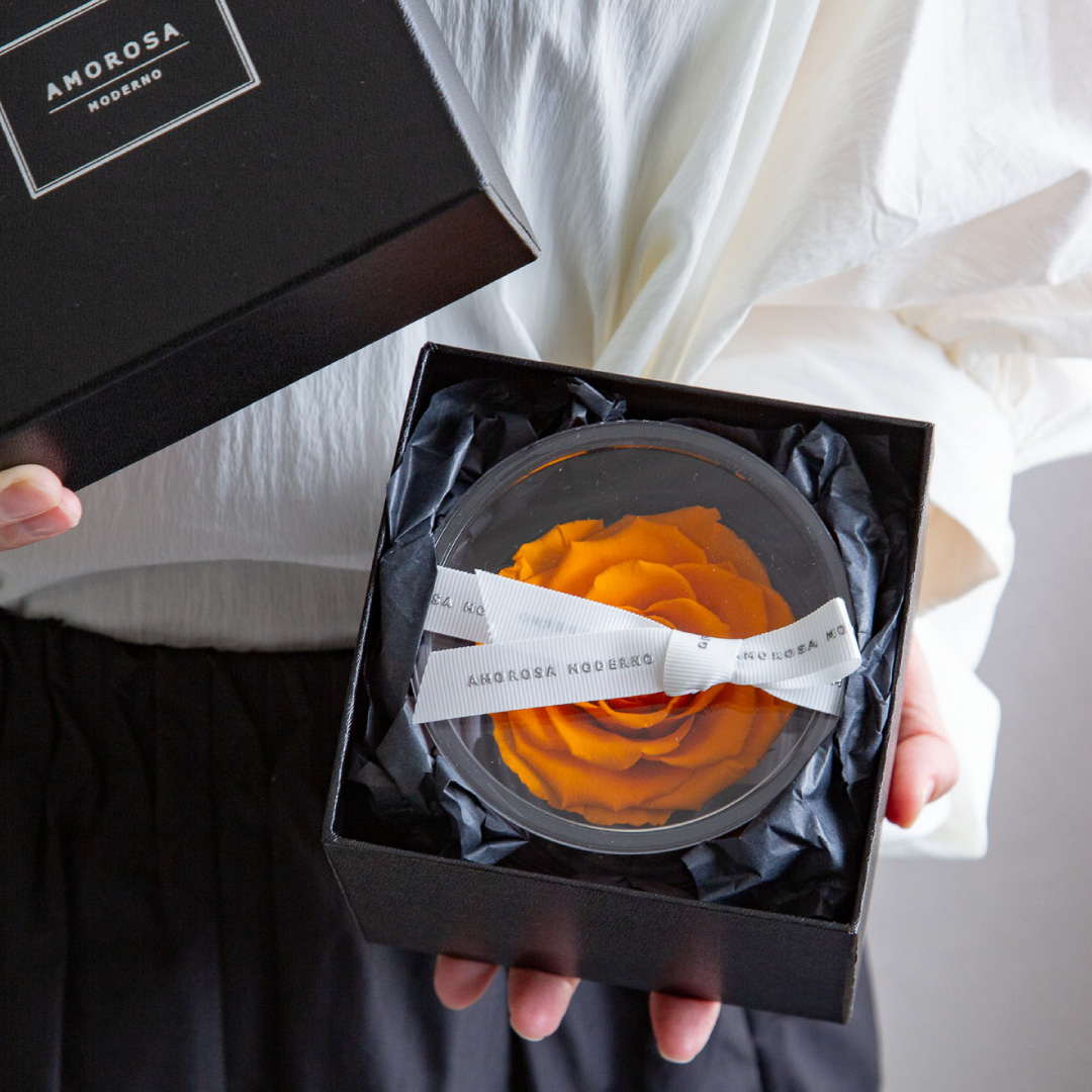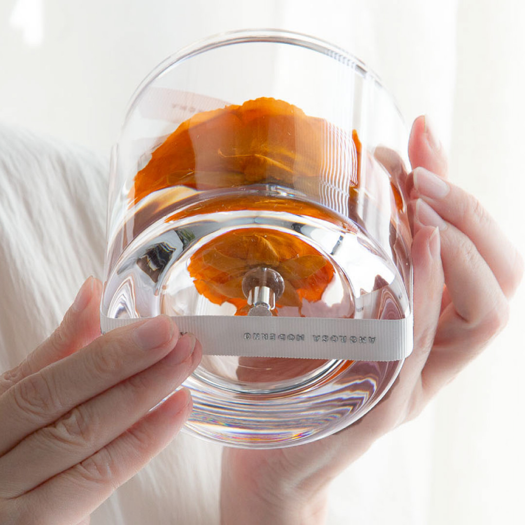 | 素材 | プリザーブドフラワー(ローズ)、真鍮、有機ガラス(容器)、アクリル(フタ)、天然水晶、リボン、化粧箱 |