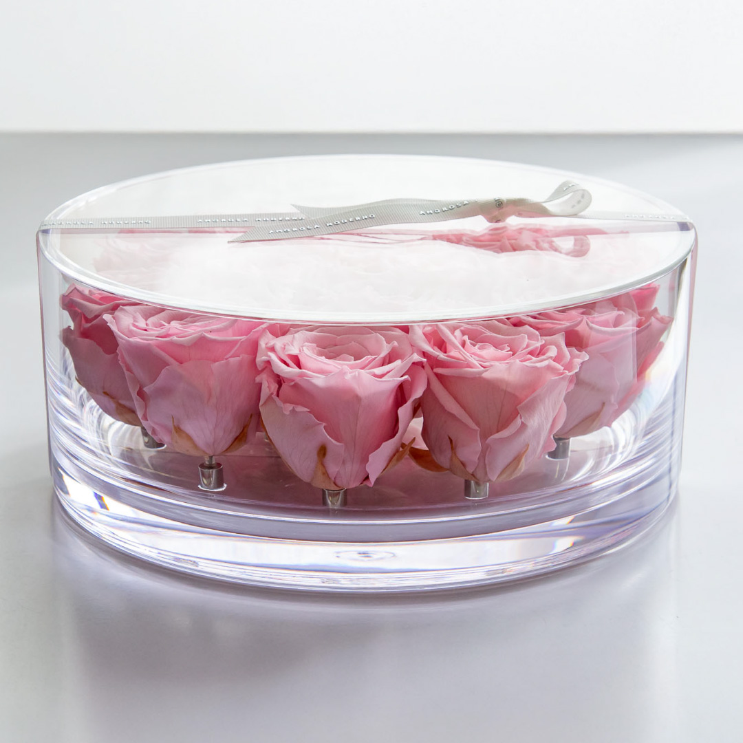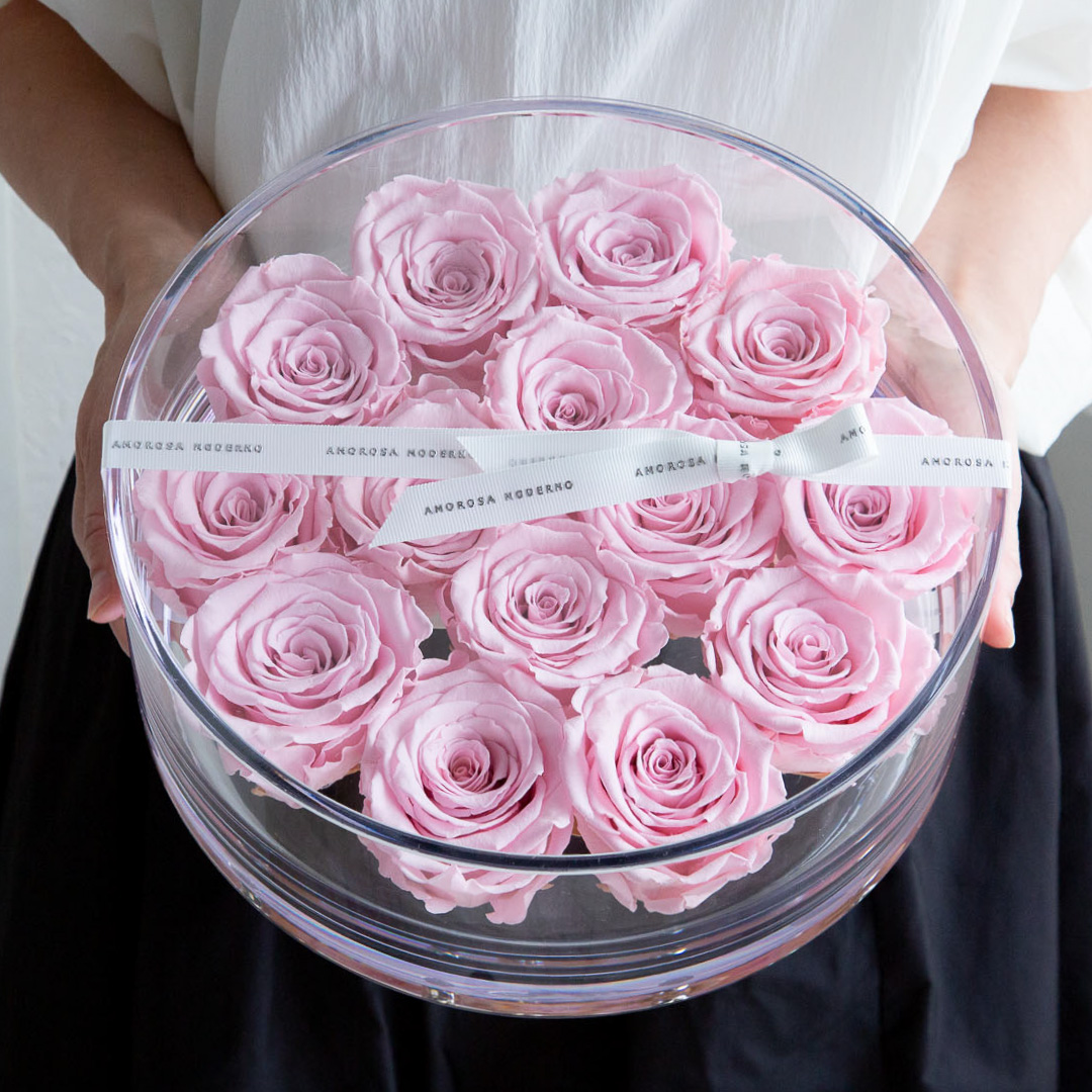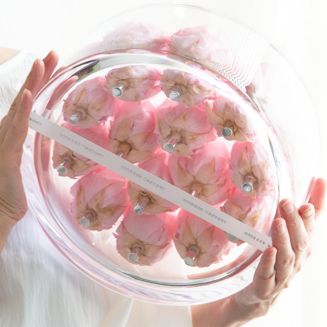| 素材 | プリザーブドフラワー(ローズ)、真鍮、有機ガラス(容器)、アクリル(フタ)、リボン、化粧箱 |