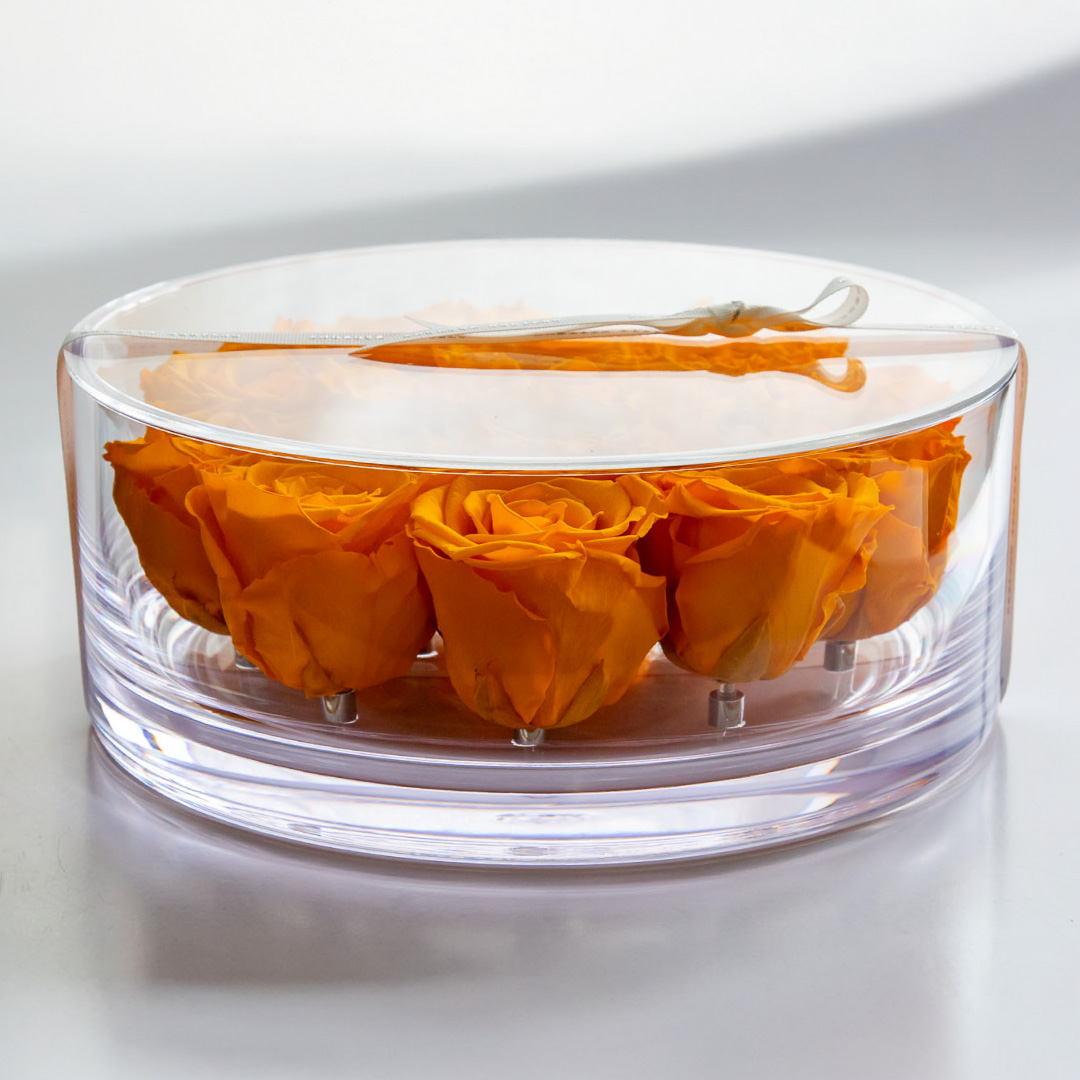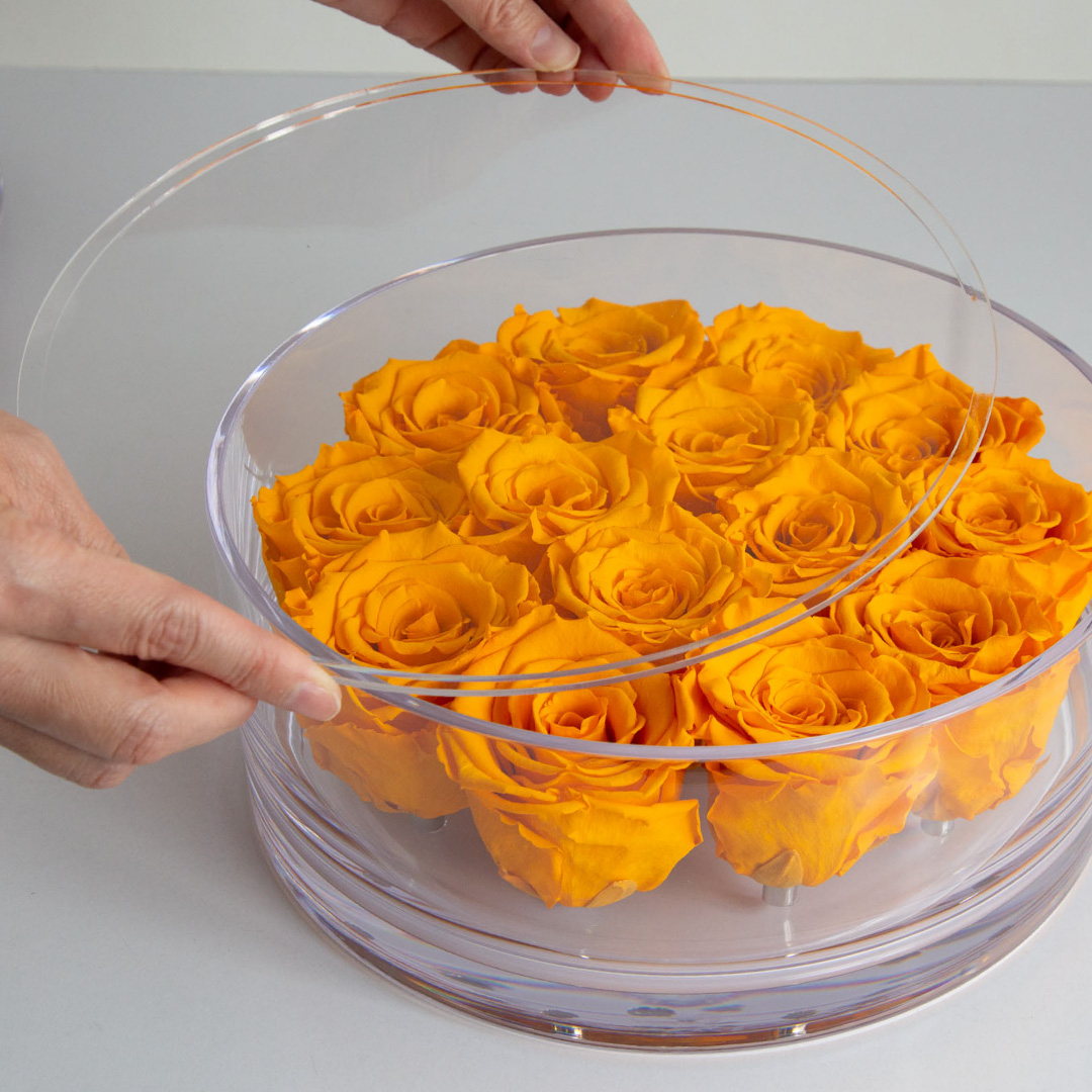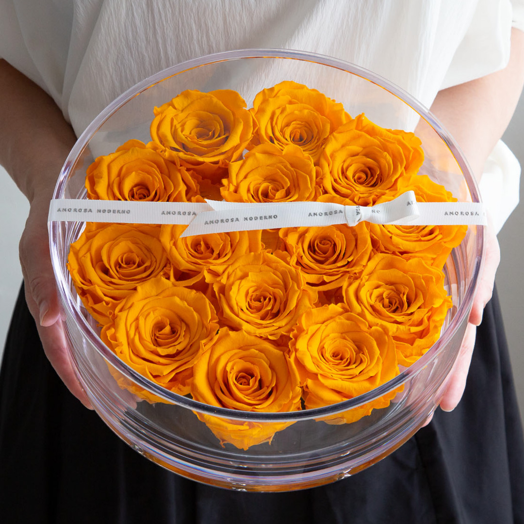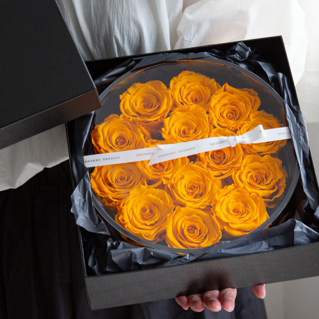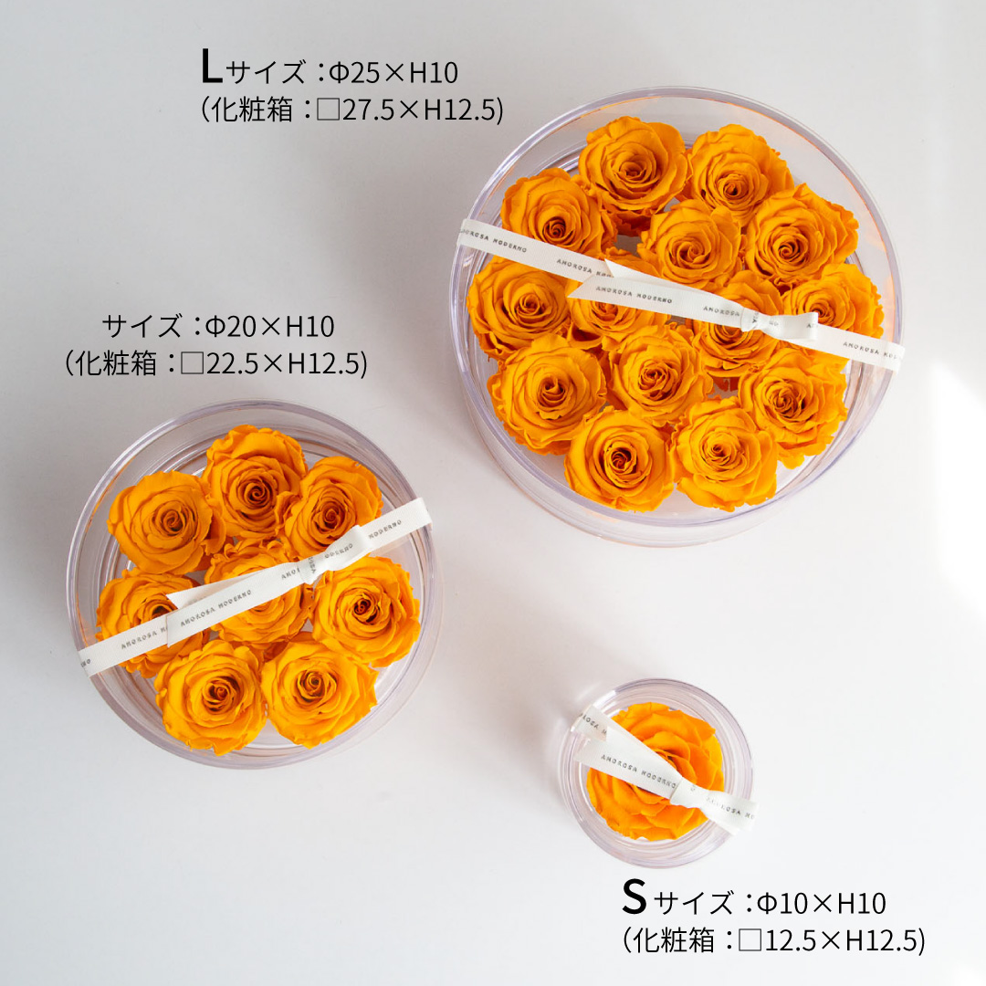 | 素材 | プリザーブドフラワー(ローズ)、真鍮、有機ガラス(容器)、アクリル(フタ)、リボン、化粧箱 |