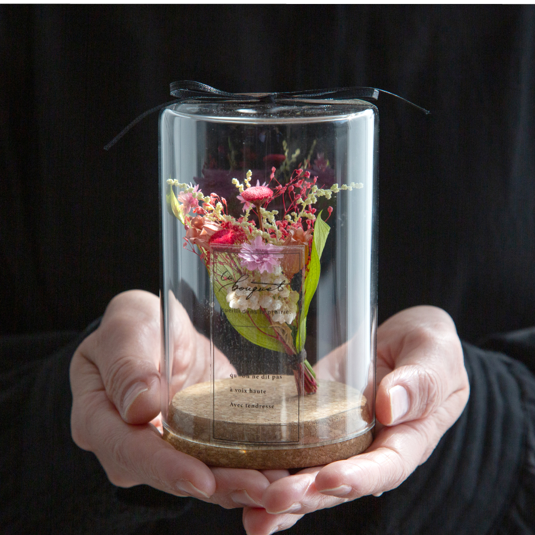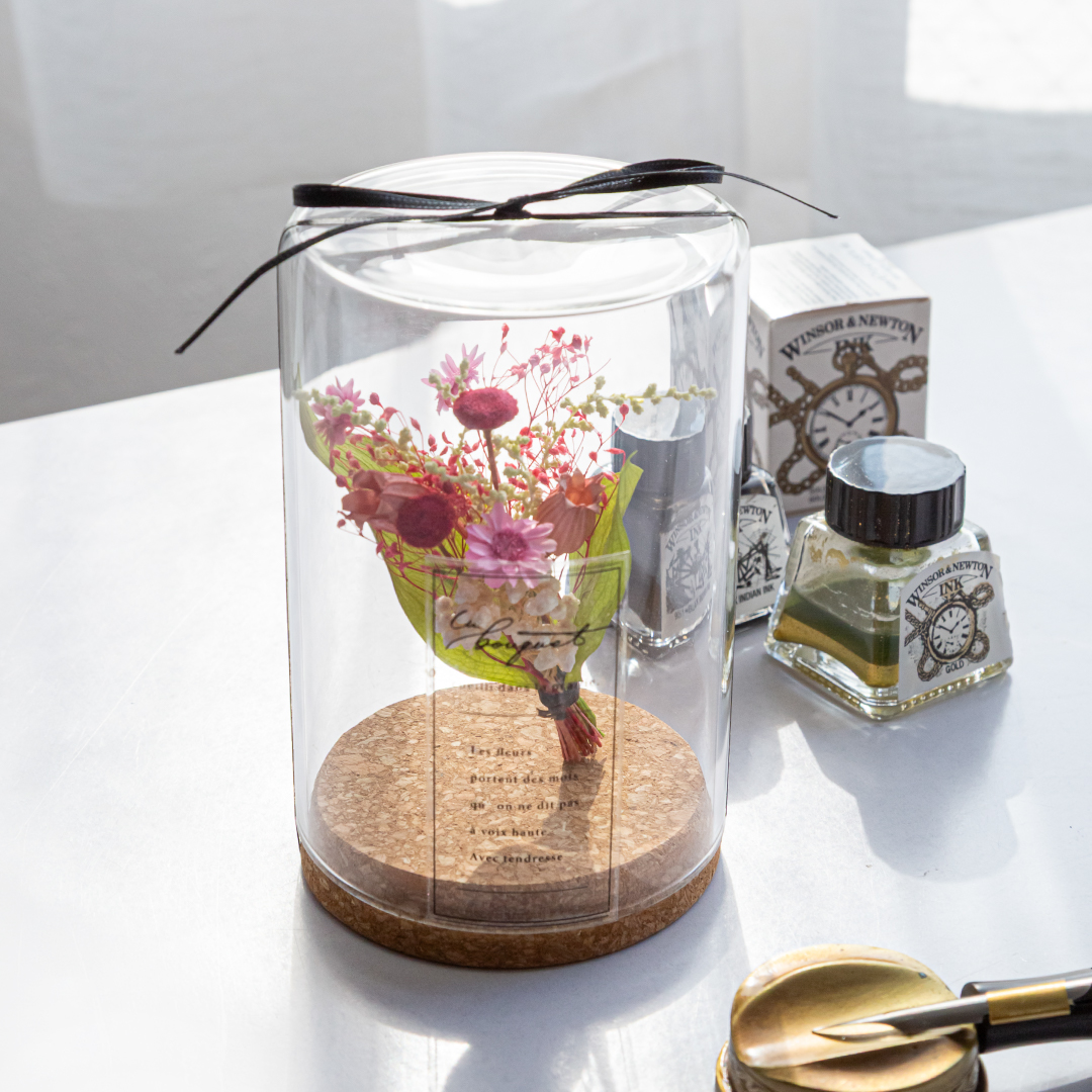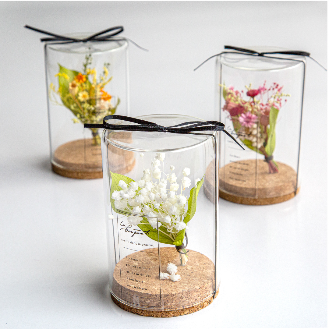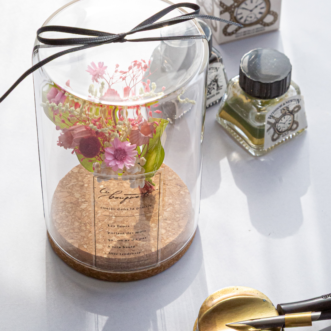| 素材 | プリザーブドフラワー ( カスミ草、グリーン等)、ドライフラワー、ドーム(ガラス)、土台(コルク)、リボン、ポリウレタン製バンド、シール |