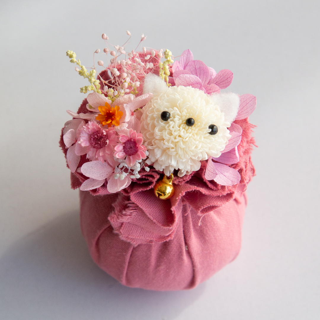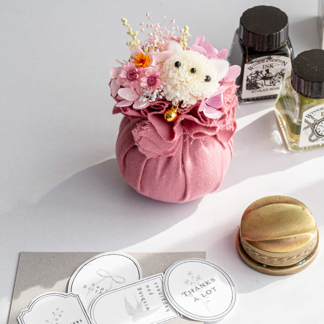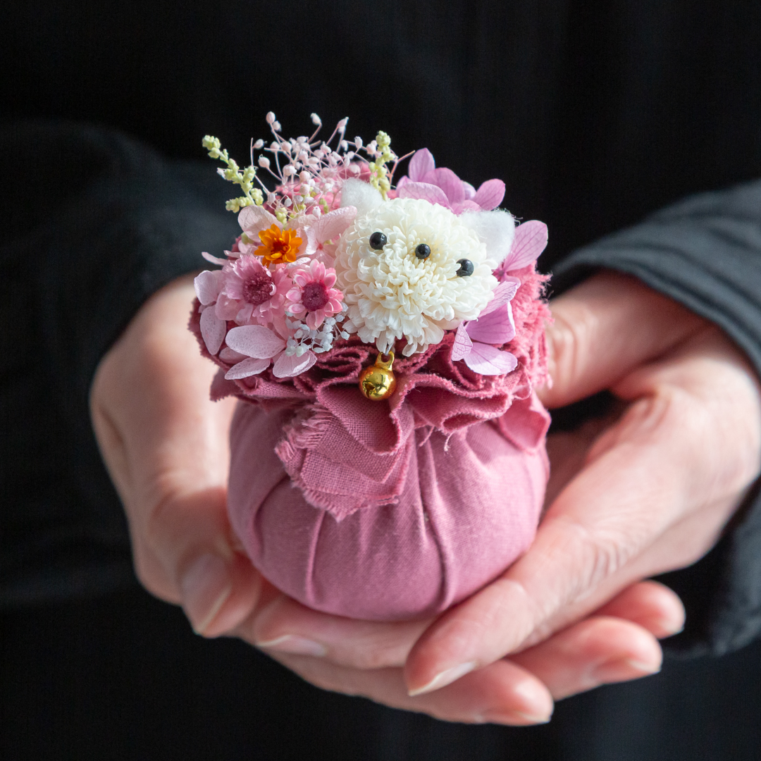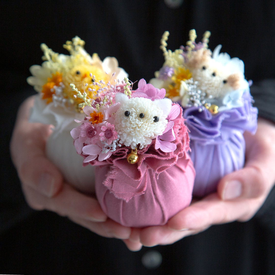 | 素材 | プリザーブドフラワー、ドライフラワー、生地、手芸わた、クリスタルストーンサンド、鈴(金属製)、ラッピングセット(透明袋・紙タグ・メッセージカード) |