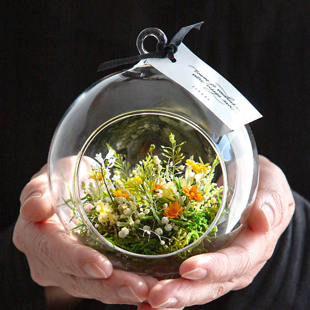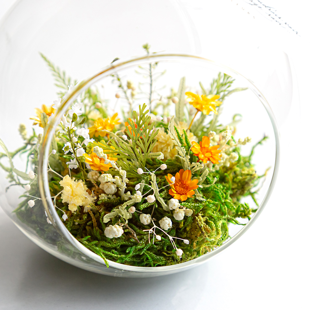 大地に咲く花や緑の美しさを、ガラスドームにそのまま閉じ込めたようなボタニカルアレンジメント。花と緑が息づく小さな自然の世界が、そっと心を惹きつけます。やさしいナチュラルカラーが空間に彩りと癒しを添え、インテリアにも美しく映えます。